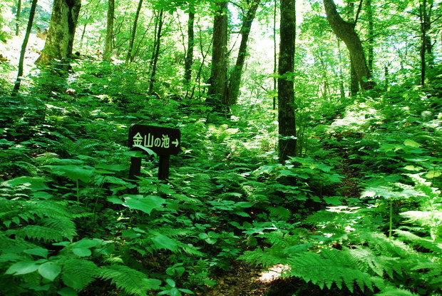 終於遇到了湖沼,名為金山の池,湖水綠色偏褐色,平靜沒有波瀾,