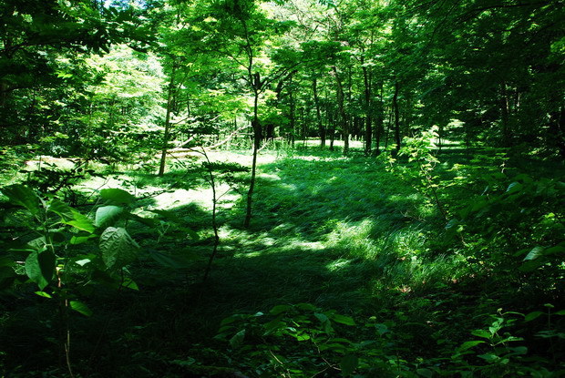 當小徑真正抵達四五郎の池,池水早已乾枯見底,長滿了植物,綠意盎然。