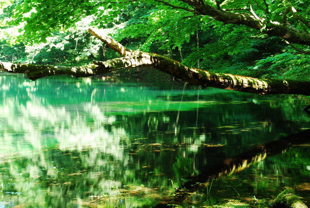 は青インクを流し込んだような美しさで、水中には枯れたブナが横た