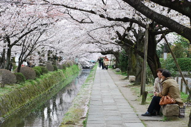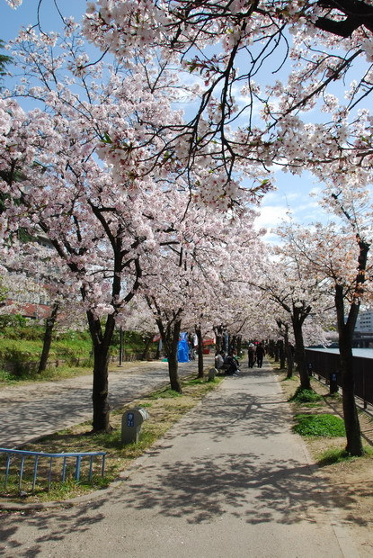 春天的桂川畔,盛開著許多櫻花,人們在樹下休憩
