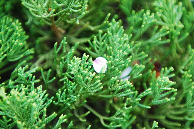白色帶有粉紅的花瓣,飄落到松柏的葉子上
