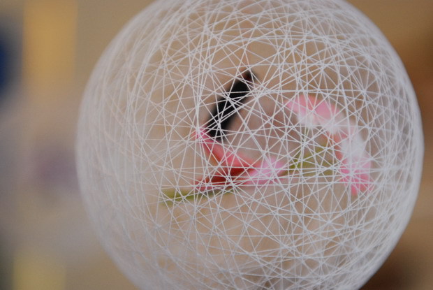 這張照片裡是一個穿著櫻花色和服的女生,坐在圓球裡