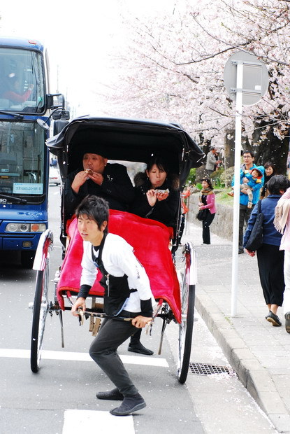 人力車上的兩個人,腰部以下披著紅毯,天氣其實還是很冷。