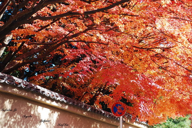4.東福寺的地址是京都府京都市東山區本町15-778。從東福寺站走到門口,有一段還蠻長的距離。(大概要走15分鐘吧)就快要到東福寺時,沿著白色的圍牆有一片火紅色般的樹林。