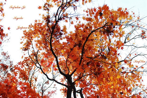 2.東福寺建於1236年(日本嘉禎2年)為京都五山之一。紅黃色的落葉,又灑在烙有三巴紋的屋瓦上。
