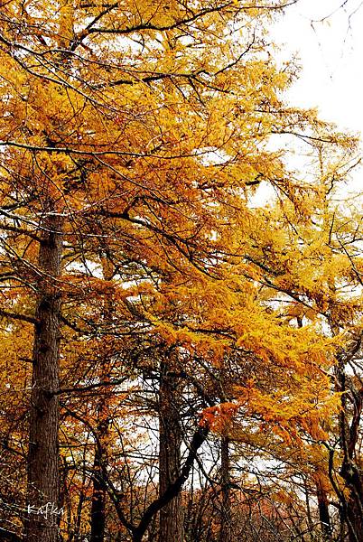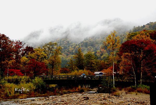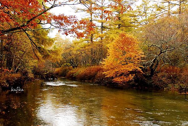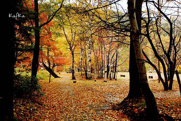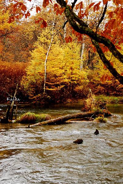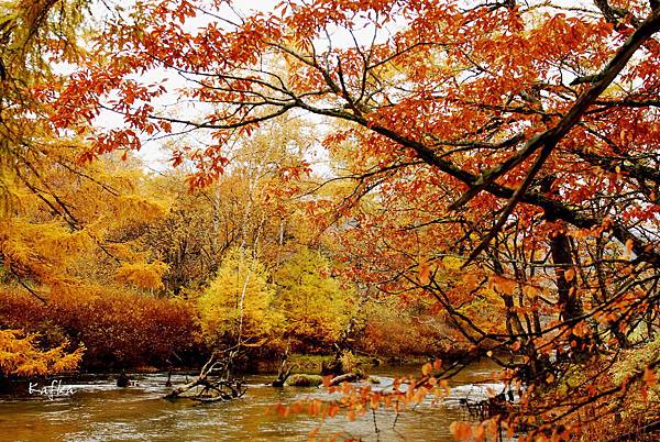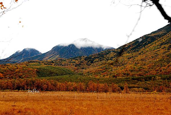 這一片濕地走起來很舒服,有落葉林、落羽松,漸漸變紅的草,在搭配遠方的男体山等日光山系山群,雖然是下雨天,但不減遊興。遇到下雨天,也是旅行的一環,天氣總是為晴天、陰天、雨天,都有1/3的機會會遇到。
