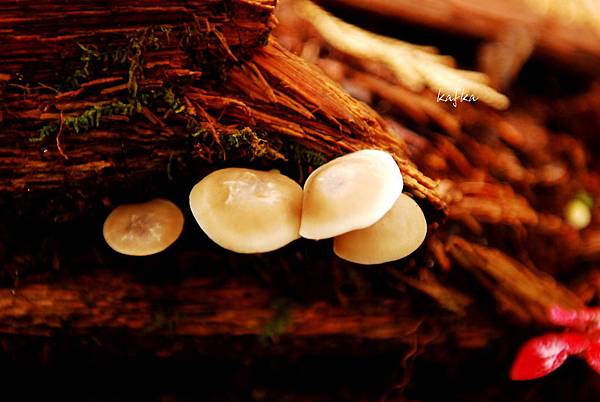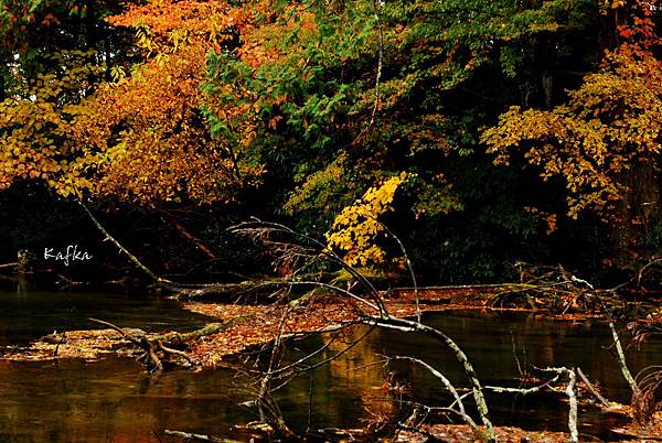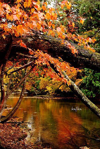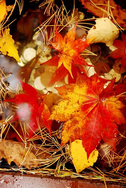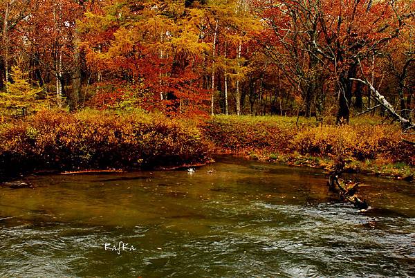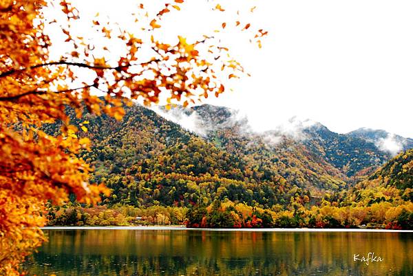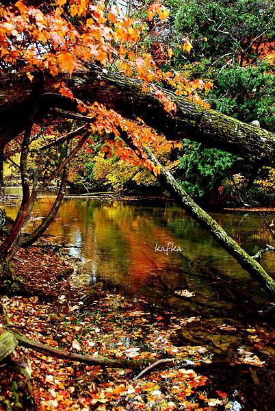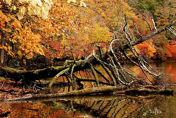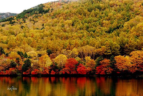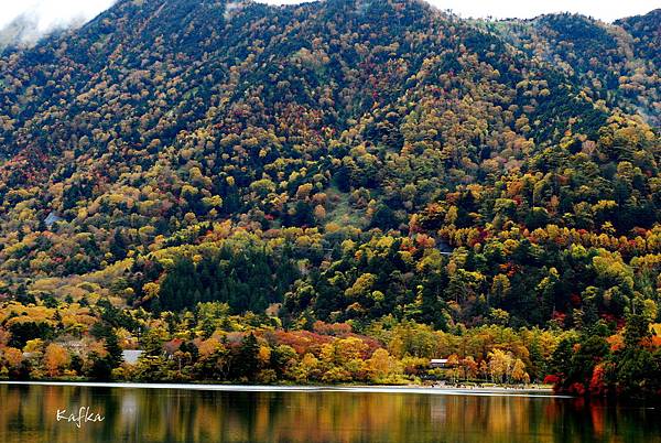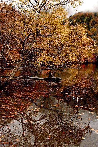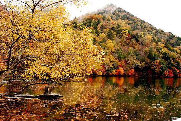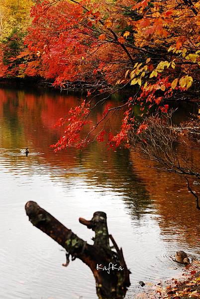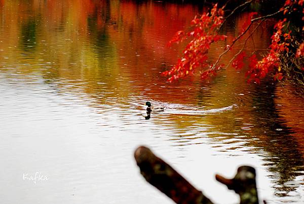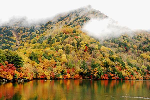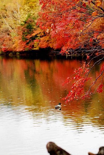 接著沿著瀑布上行,也就是到湯滝的入口,是湯之湖的另外一端,湖水從缺口落下而形成瀑布。沒想到10月上旬,日光的秋警就非常美麗,山巒在植物的點綴之下,有紅色、黃色、綠色,呈現豐富的色彩,倒映在湖畔的邊緣,偶有枯枝樹木陪襯,增添秋天的氣息,沿著小徑稍走一段,留意周圍經過的小植物、小香菇、落葉也有不同的感受,偶然遇到湖中的小鴨鴨,看著他悠閒的划著,自己也感覺到漫活的感受。
