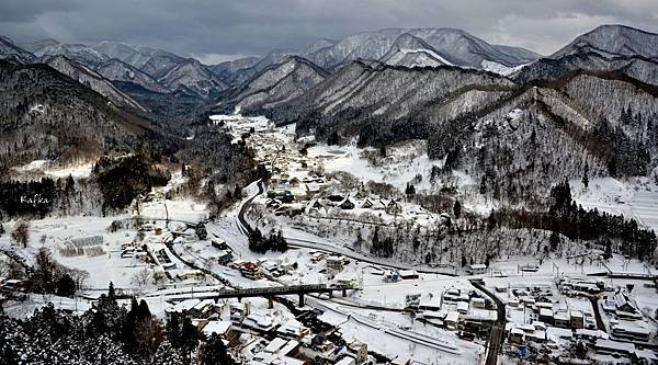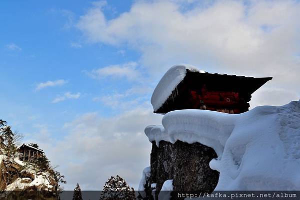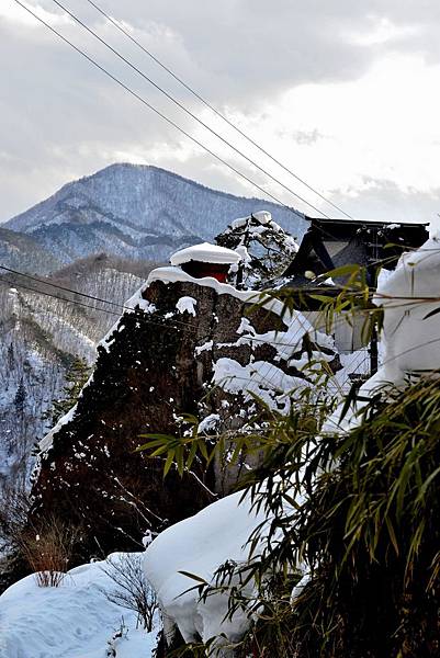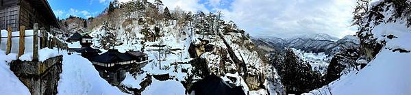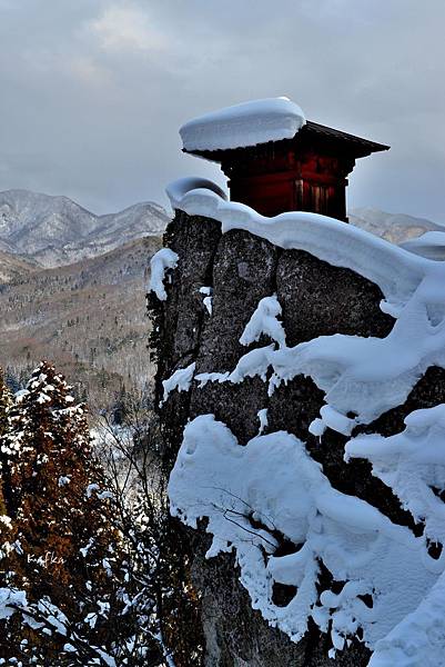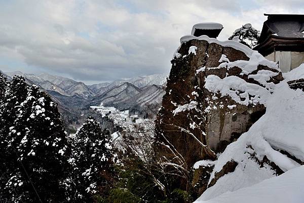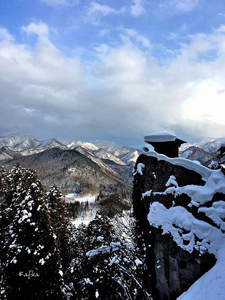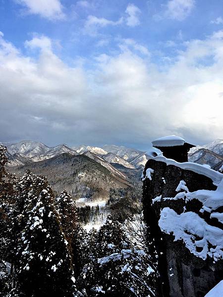 五大堂展望台的邊緣還有冰雪,所以穿鞋子壓在上面會滑滑的,但是展望超好的,可以看到大東岳、高倉山、面白山,以及被環山所包圍的村落。雲把山寺的南邊都包住了,所以就是烏雲一片,可是靠北的地方卻是藍天,所以往釋迦堂拍就會有藍天。
