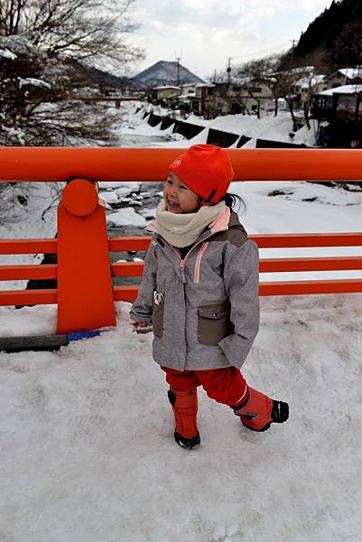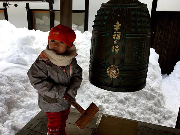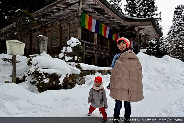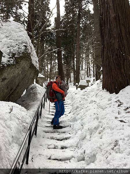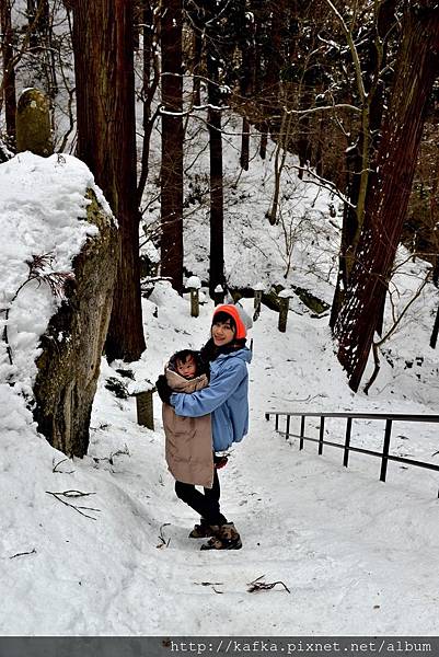 一口氣抱著女兒從登山口走到仁王門也是很喘,路上都是積雪,所以一步一步穩穩的走,抱著女兒走在山林裡面覺得很愜意,過了仁王門之後,視野變的開闊,先到觀明院,不過天氣很冷,寺廟也沒有開,很多路都封住了,這時候有兩條路,一條走到奧之院,一條往五大堂走,這時候我跟家人說爸爸先往奧之院的方向走過去,家人門在觀明院前等著我,這時候觀明院前有一堵雪牆,雪牆裡面有一個小洞,剛好小女的身體可以塞的進去,就在雪地裡玩了起來。