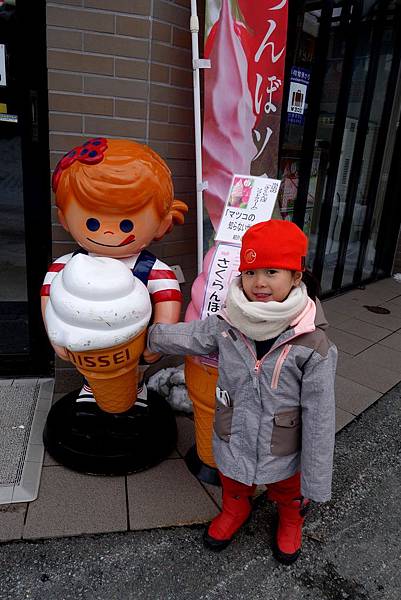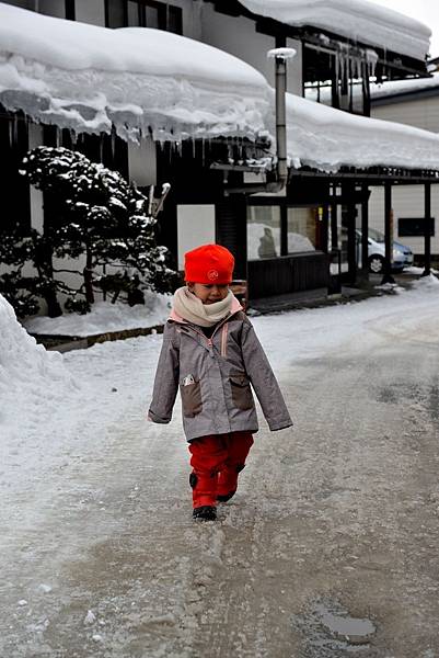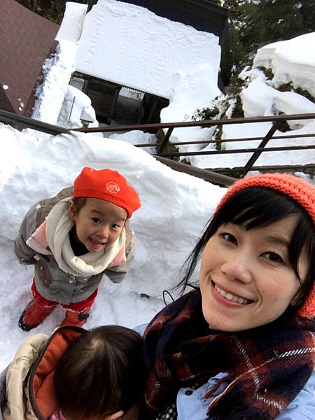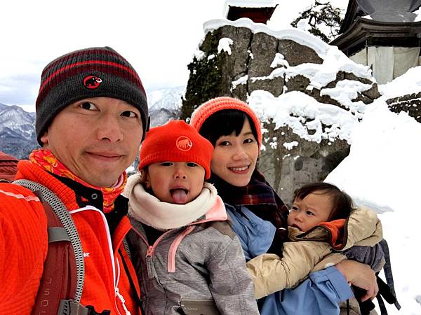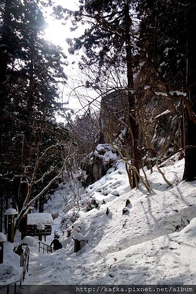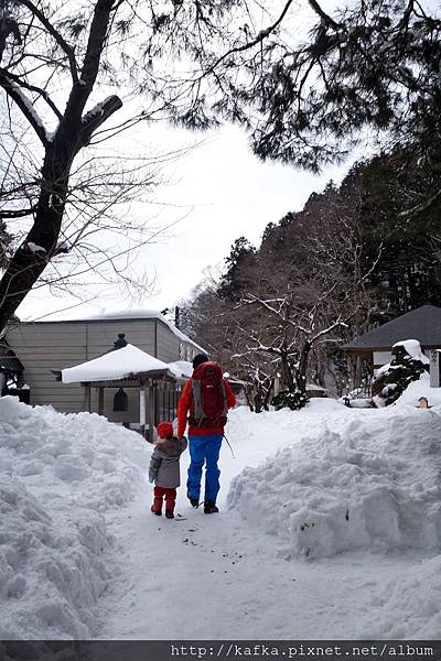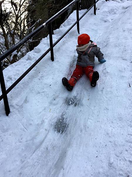 下山也是一大考驗,我把所有的物品都塞到背包裡,然後抱著小女緩緩下山,每一步都很戰戰兢兢,當然也一直跟太太說也要小心喔!沿途不斷聽到滑倒的聲音,上山也滑,下山也滑,還好我是有備而來,都把冰爪跟登山杖準備好了,其實去年去長野montbell時,我還買了一隻冰斧,現在都還沒有機會使用。途中還有一群日本女孩,其中一個女生穿超短短褲,太太說這個女孩真勇敢,現在可是冬天,我們都包的緊緊的。