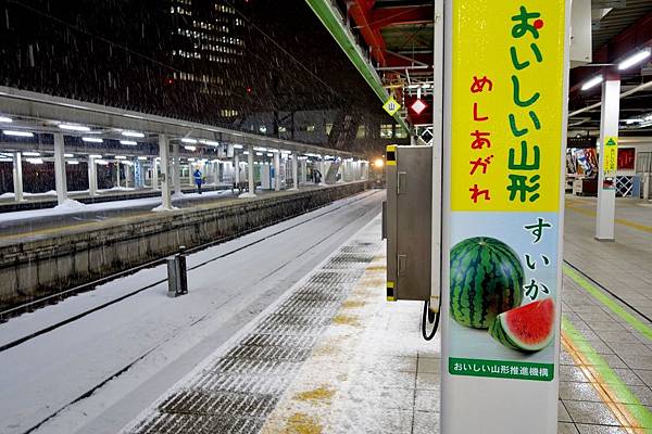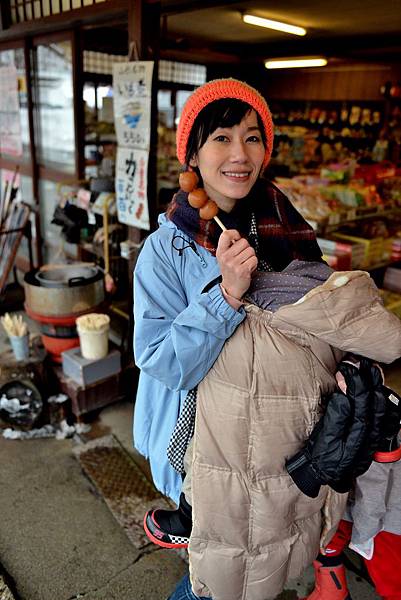 登山道離車站有一段距離,也慢慢的走到車站,過橋的時候有一個商店,賣熱滾滾的蒟蒻,對於山寺有很深刻的印象就是有熱騰騰蒟蒻,小女吃第一顆很開心,不過覺得怎麼那麼鹹。隨著太陽沒入地平線,也開始變冷了,一旦身體沒有動,也很容易變冷,回到山形市,也天黑了,也開始飄著雪,過來的時候下雪,離開的時候也下雪,這是又來到之前曾經去過的山寺,回想過去曾經走過的路,感覺很開心。