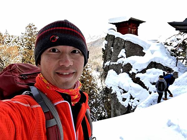 我自己則先往金乘院的方向走去,然後到華藏院再回頭帶小孩,不過冬天步行真的要小心,不像是夏末秋初可以用很快的腳程走完。回頭還是帶著太太跟小孩一起往五大堂的方向走去,從開山堂到五大堂的一小段路很抖,大概有40度吧,還要拉繩子,不過上去很容易,下來就很抖,因為我們各抱一個小孩,到了五大堂木造建築,先脫掉雪爪,才踏上去,其實穿脫雪爪還蠻麻煩的。