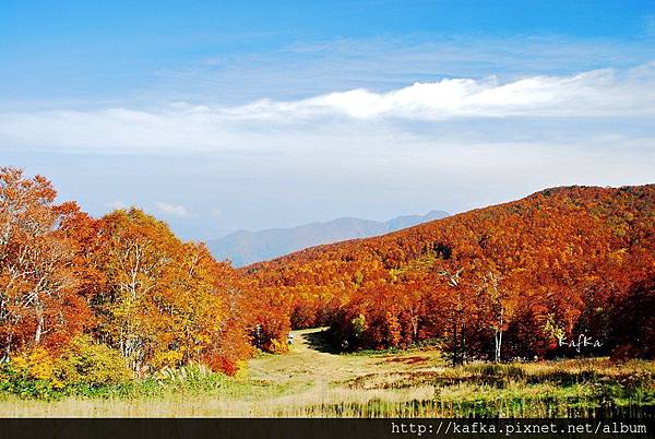 [照片] 過了鳥兜山前往片貝沼是一個平緩的步道,可以看到紅葉的大景,這一段會經過紅葉峠,這張照片從上到下共分為四層,分別是最上層的藍色天空,次層為片片白雲,其下就是一整片的紅葉林相,最下層則是青青草原,我也很喜歡這一張照片的感覺,若可以在這邊野餐,直在是太棒了。