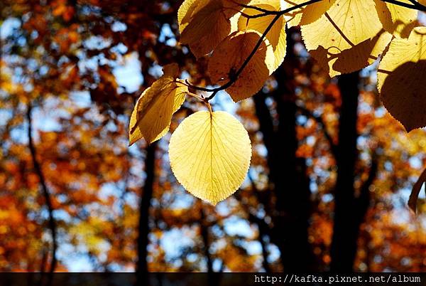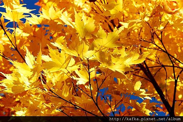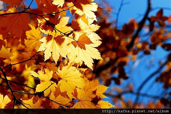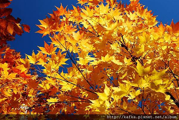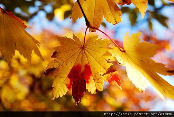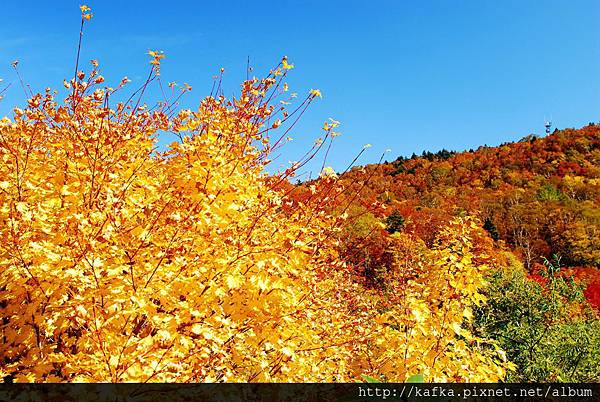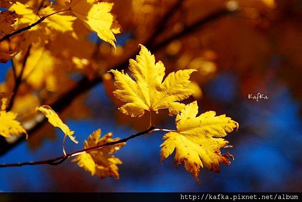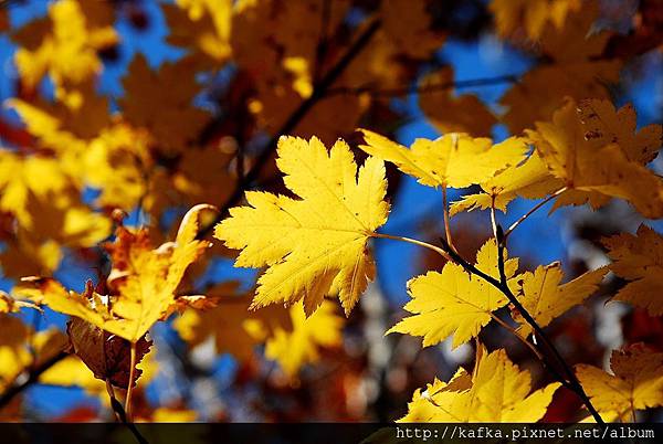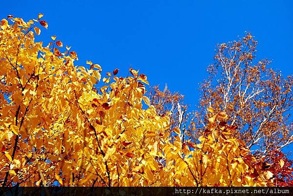 [照片] 蔵王溫泉中央高原紅葉散策,一大早出門,剛好遇到藍天,通常山區一大早會有太陽,過了10點以後,就開始起霧了。這一張是最自然的楓葉,紅色褪去變成黃色,葉緣也有些枯萎,這種藍色是因為我裝上了CPL(會因為太陽與拍攝者的角度,而呈現不同的藍色),喜歡這樣的藍天。
