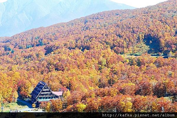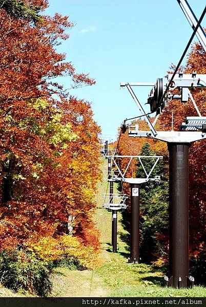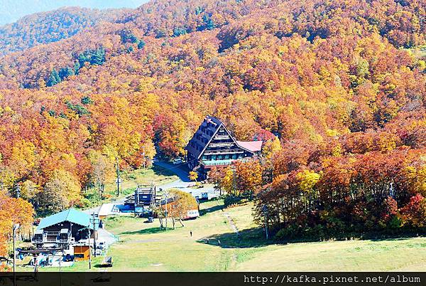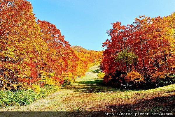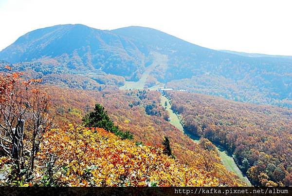 [照片] 當我走到這裡的時候,對於眼前所見的景色覺得好驚訝,這太美了吧!之前只有在美國看過這樣的大景,在日本也能看到覺得好開心,中間應該是滑雪道吧,到了冬天,會有成千的人在這邊滑雪,好美麗的滑雪道、防火巷,青青的草皮敷滿大地,兩側的紅葉綿延到天際。
