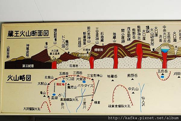 [照片] 蔵王中央ロープウェイ鳥兜駅前面掛了一張蔵王火山斷面圖,大概說了這一帶的地質情況,之前蔵王溫泉是一座大山,不過爆裂後,就只剩下火山底,也就是現在的蔵王溫泉,原來的竜山一分為二,其中一座就是鳥兜山了。