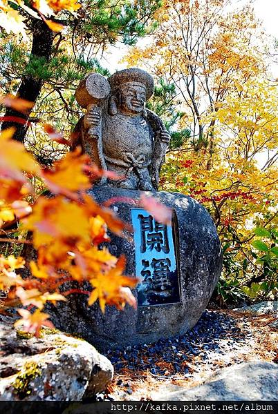 鳥兜山附近有一個展望台,算是一個很好的視界,制高點可以看到一整片的紅葉林,還可以看到三五郎屋被紅葉所包圍,附近還有一個大黑天,應該說是這三條纜車都會經過一尊神像。還有一本簿子可以蓋章,等下一篇再來介紹。