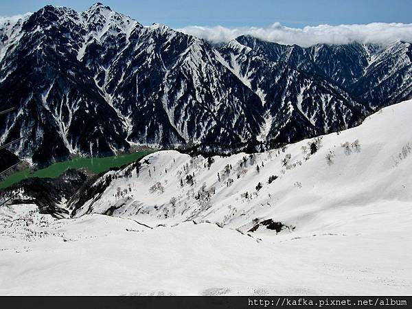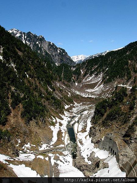 (照片說明)黑部水壩的另外一邊,平常沒有洩洪時的黑部川,水量就明顯不夠,但這不是重點,溪水的顏色也很美,河岸兩旁還是被白雪覆蓋著。