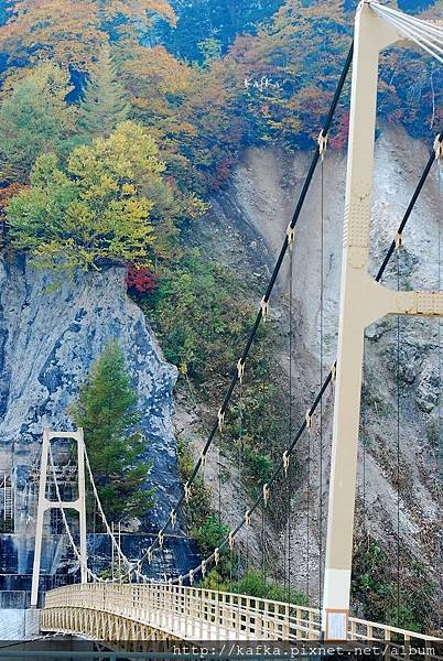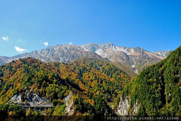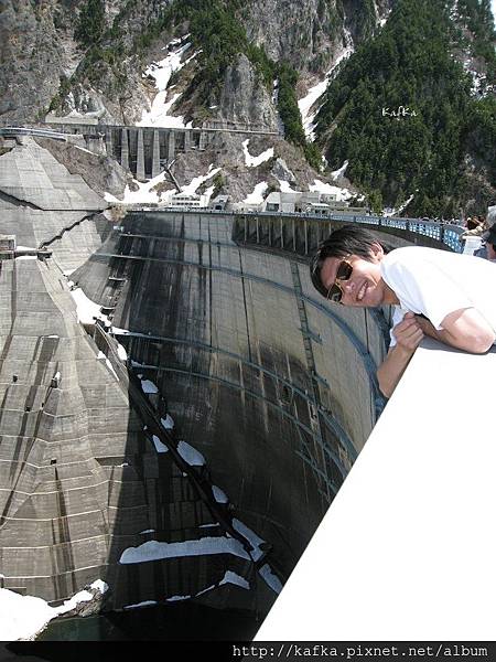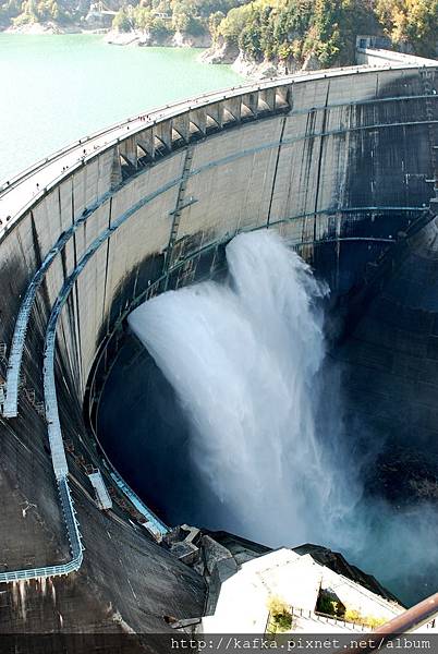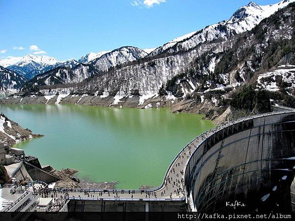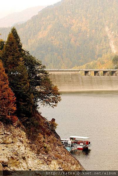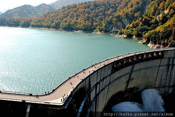 (照片說明)放了兩張黑部水庫大壩的照片,一張是在秋天拍的,不過大壩的位置比較低,紅葉還沒黃到下半部,另外一張是春天拍的,依稀還可以看到山坡上的殘雪。