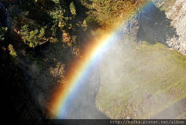 (照片說明)黑部湖的湖水穿過大壩的小洞,噴濺出許多細小的水珠,在陽光的折射下,變出了顏色鮮明的彩虹!