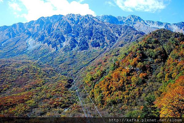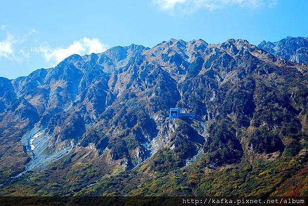 (照片說明)在黑部平,要是想要拍纜車,背景就會是立山連峰,此時的立山連峰的植批已經開始變色了,在等待纜車的同時,不妨找好角度,連同雄山山頂也都可以入境。