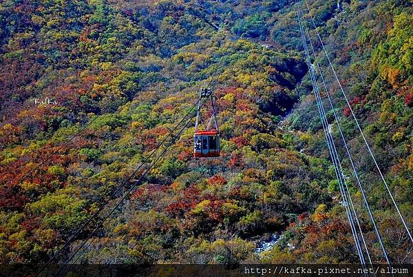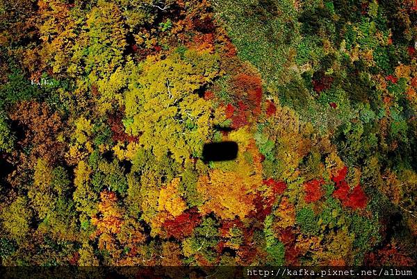 纜車的影子就在正中間,下面的落葉林五顏六色,似乎為著纜車的影子在旋轉,覺得很有趣。