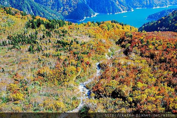 (照片說明)從大觀峰往下看,可以看到黑部湖,也可以看到纜車另一頭的車站,會選這一張是因為有拍到黑部平,纜車站前面剛好有一塊平坦的地方,也是眺望環景的好處所。