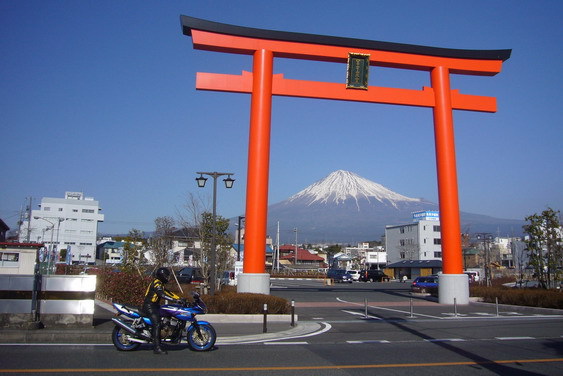 富士宮神社,富士山被紅色的大鳥居給包圍住了