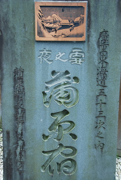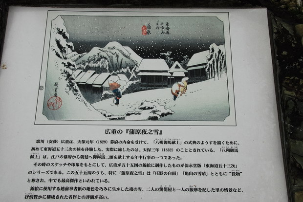 碑上寫著蒲原宿,也將廣重的夜之雪孚世繪雕於其上。