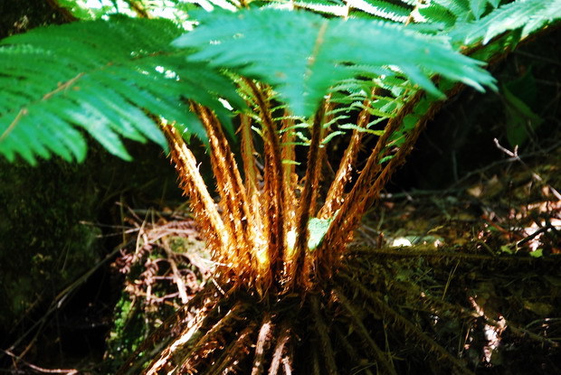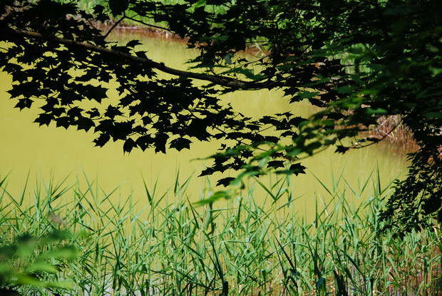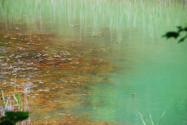 沼はアシの根元に、酸化鉄の沈殿物で赤みがかってるのもあり、