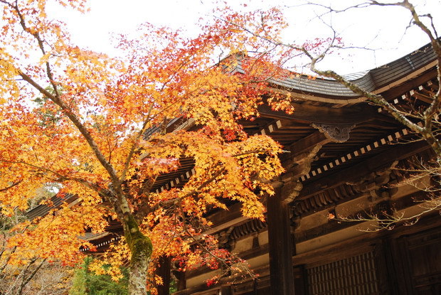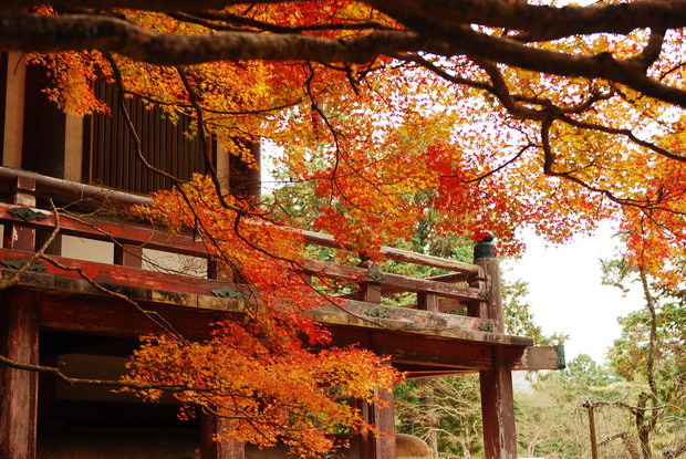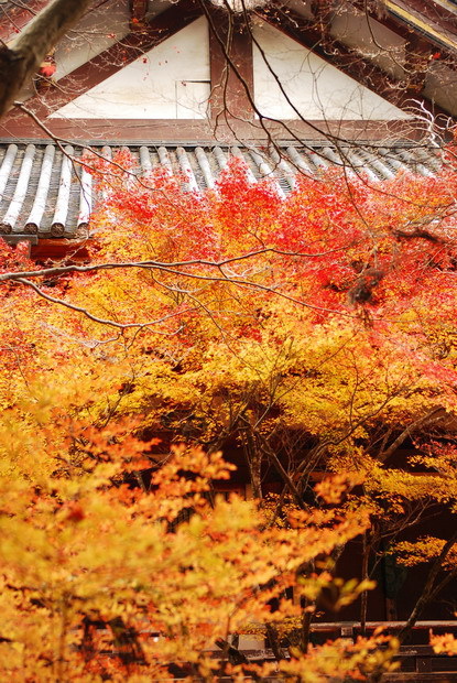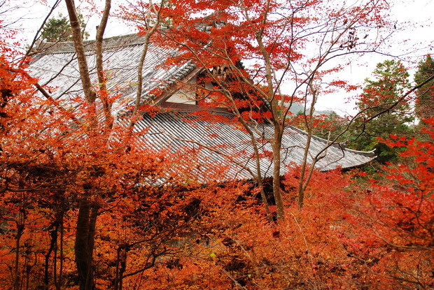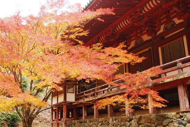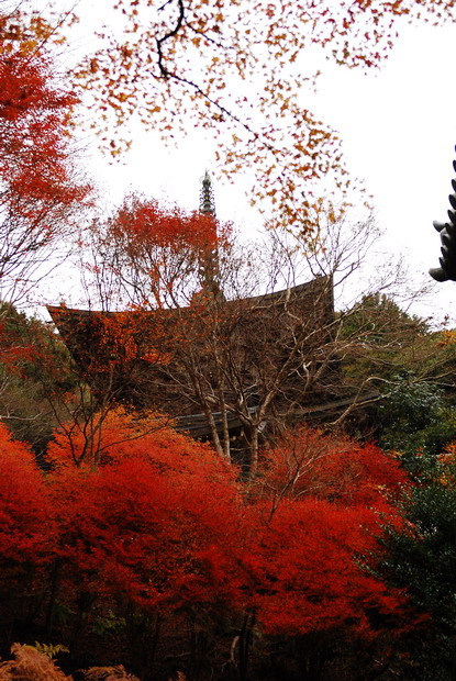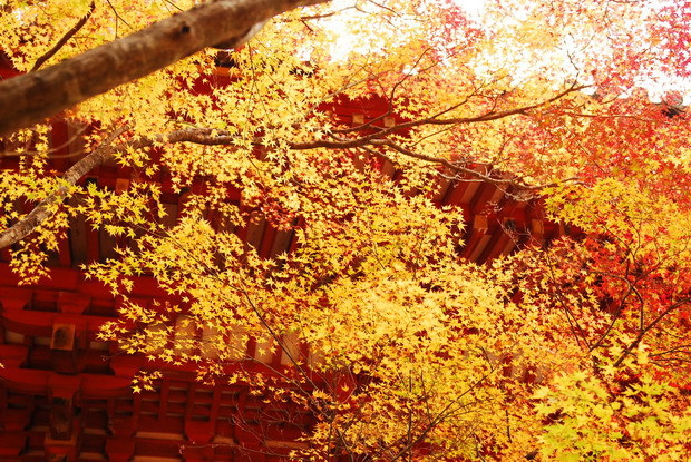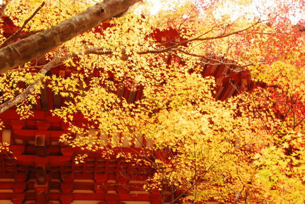 從多寶塔往下走,依然可以看見紅色的葉子與金堂建築所構成的印象