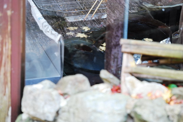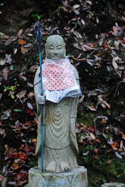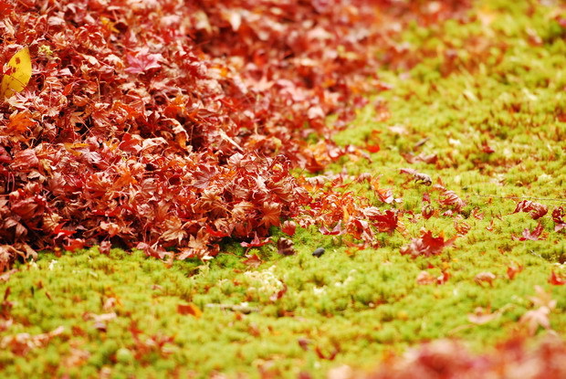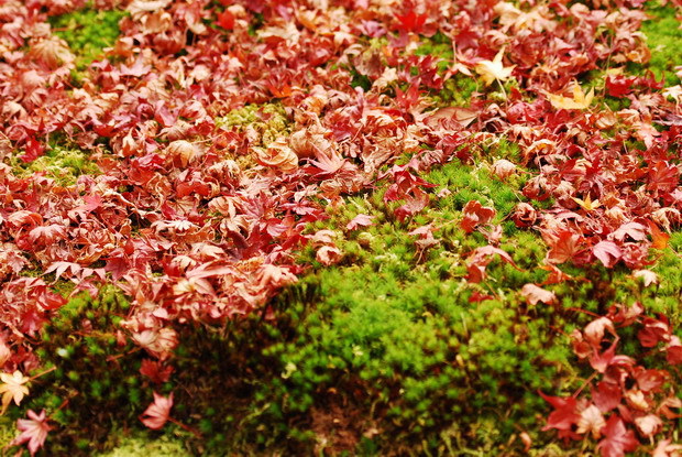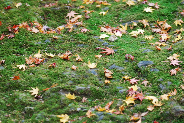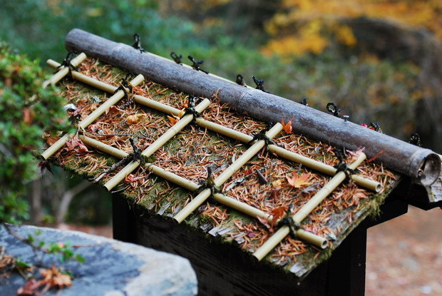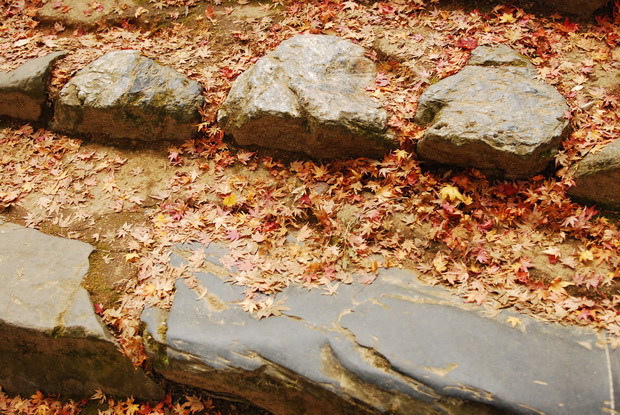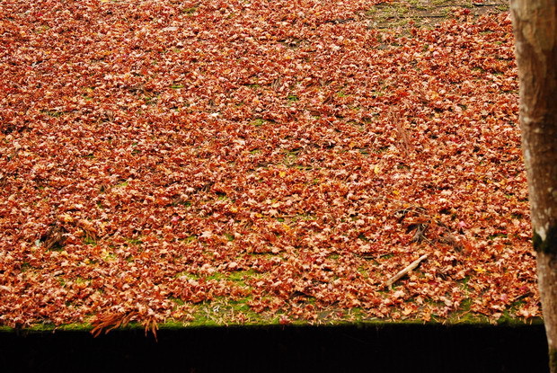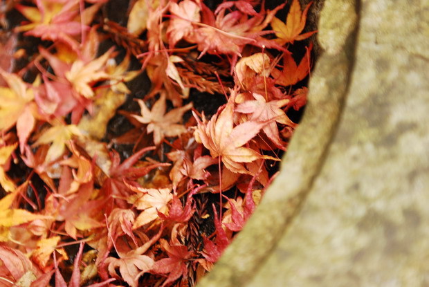 地藏院前的流水槽,沒有流水或積水,取而代之是一整盆的落葉