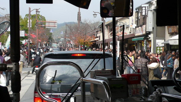 車子緩緩的出發,這裡還是嵐山,塞車蠻嚴重,兩側都是賞楓的人潮。