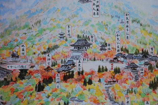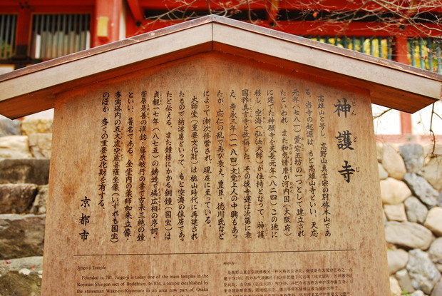 多寶塔前的木牌,告訴著我們神護寺的起由