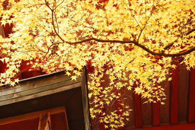 金堂旁的黃金色的葉子,襯托出木質建築的廟宇,