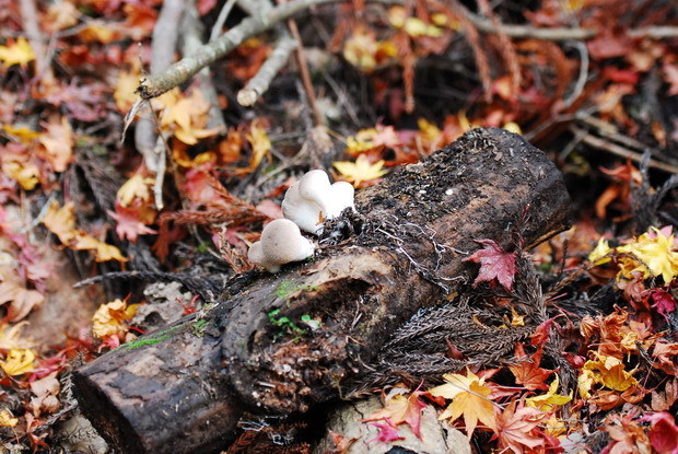 這一段枯木,上面還冒出朵朵白色的蕈類