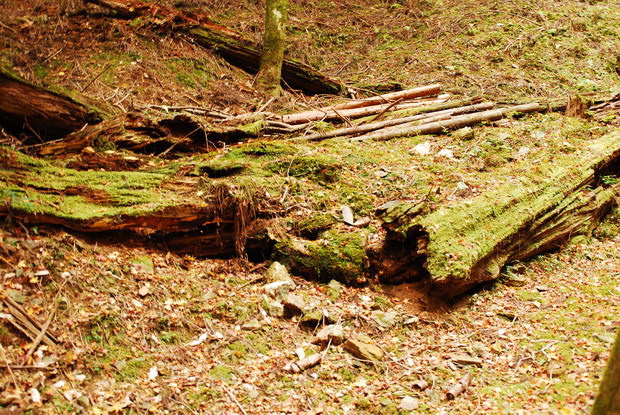 山坡地被落葉覆蓋,往前看似乎很多枯枝。