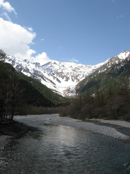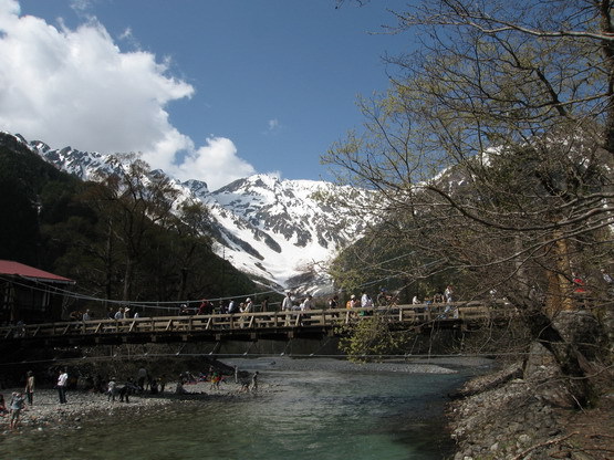 上高地的象徵——河童橋是一座木制吊橋, 從橋上朝上游望去, 並排聳立著西穗高嶽、奧穗高嶽、前穗高嶽、明神嶽等海拔3000米 級別的山峰. 朝下游望去, 則可以看到正在噴煙的燒嶽. 而穿流於鑽天柳、落葉松林間的梓川風景也很優美, 是絕好的眺望台.