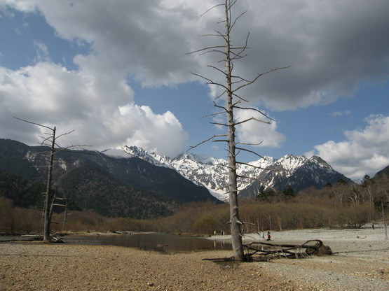 新春的上高地,高山上的積雪未褪,許多步道依然是封閉的。