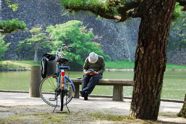 將腳踏車停在一旁,坐在城下的椅子上。閱讀著。