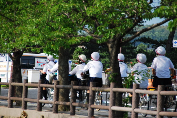 一群國高中生,成群結隊,穿著制服,戴著安全帽,緩緩徐行