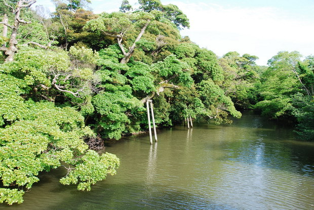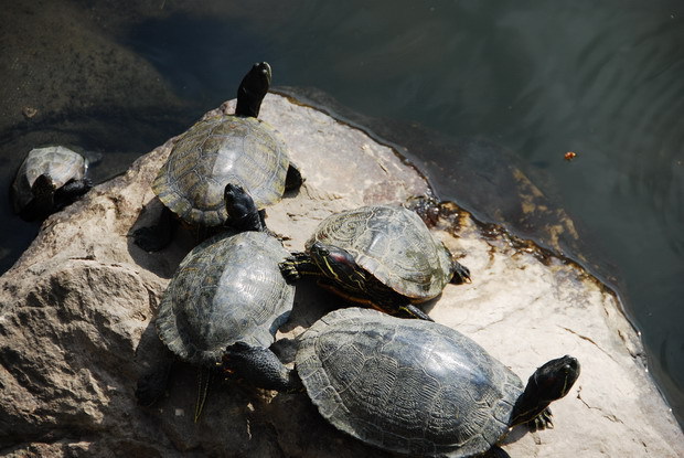 不一會兒,就抵達縣廳及松江城畔,城堡旁的護城河,有烏龜悠閒的在曬太陽,