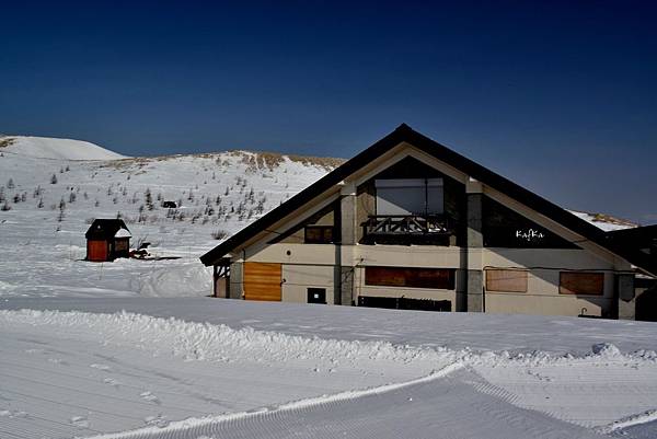 冬天的方式就是從草津搭纜車到山頂,出了纜車站之後,就是滑雪道,可以看到一堆人是準備要滑雪的,但是也可以看到去湯釜的,也就是沒有拿雪板或雪橇的人,就可能是要去湯釜,纜車站的右手邊有一條平坦的道路,大概走不到一公里就可以到弓池,也可以看到被白雪埋沒的餐廳屋頂,原則上走到弓池就是所謂的腰繞,平穩的路徑,到了白根山停車場才是所謂的上坡,假如只是要去湯釜,也不用爬很高,而且目標很大,所以也不會迷路。
