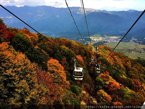 [照片說明]搭纜車也要一段時間,兩公里約十幾分鐘,我以為已經夠久了,不過這次去白馬的拇池自然園,搭拇池的纜車更久,要半個小時,直線距離大概五六公里,來回票價要3600円,不過想想可以省去一大段的山路(反正也不能開車上去),又有美麗的景色,似乎也值得。