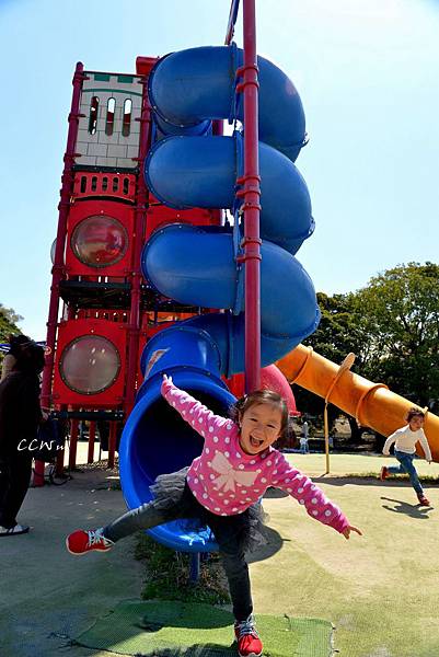 櫻花很難預測,原本今天的形成是要直接去宇治,不過名古屋在5號的狀況很好,當下決定去山崎川,不過在路上經過大高綠地公園,導航上面寫著恐龍公園,於是就帶小孩進去。雖然是星期五,可是很多家長還是帶小孩來野餐,我們只有在公園的一小部分,那邊有恐龍形狀的溜滑梯,還有好幾種設施,兩個小孩就玩得超級開心,旁邊也有廁所跟食堂,非常方便,在食堂遇到一個阿公帶兩個孫女,那個阿公說去過兩次台灣。