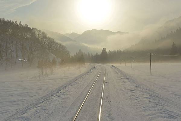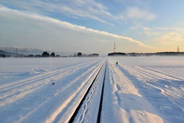 2019 的足跡-秋田內陸線,列車就快要抵達角館,伴隨著我們的夕陽也逐漸沒入地平線,現在應該是在西明寺至羽候太田之間吧! 夏天的時候應該長滿稻子,可是冬天的時候田地就會被冰雪覆蓋,好廣闊的土地阿,地面滿上薄薄的霧氣,好夢幻的感覺。