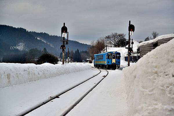 2019 的足跡-冬天的日本-秋田阿仁和站,正在等待著火車到來。秋田內陸線只有兩節車廂,大部分要回角館的旅人都會搭乘傍晚的列車,這時候阿仁和車站都擠滿了旅人。雖然回程沒有座位可以坐,但是站在前後的車窗欣賞美景,就心滿意足了。