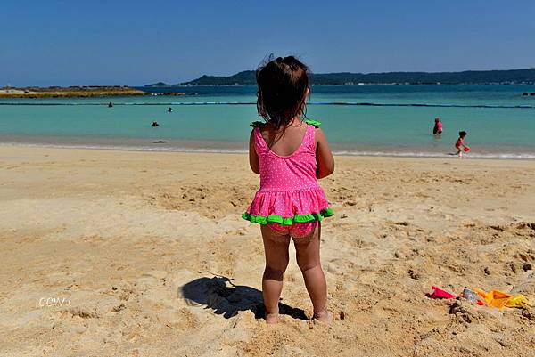 2019的足跡,來到夏天的沖繩,第一個海灘是那霸市往西的クリード西原マリンパーク,小女正準備要下水。