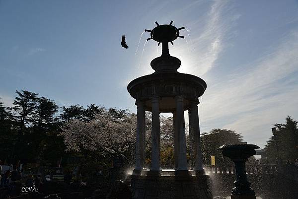 2019的足跡,春天的名古屋,鶴舞公園,公園中心的噴水池,剛好有一隻烏鴉飛過,噴泉的水飛濺到兩邊,散射著陽光。