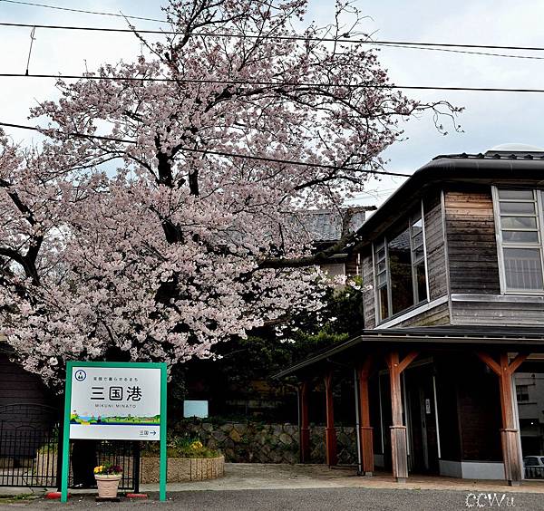 2019的足跡,福井的鐵道,三國港站,很偏僻的小站,車站的結構體很古老,月台旁邊有一棵滿開的櫻花